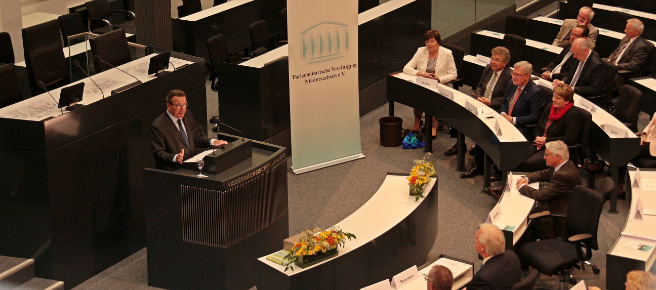 Hannover - Die Parlamentarische Vereinigung Niedersachsen (PVN) konnte zu ihrem zehnjährigen Bestehen, das am Montag im festlichen Rahmen im Interimsplenarsaal des Niedersächsischen Landtags in Hannover gefeiert wurde, zwei der prominentesten Politiker des Landes in ihren Reihen aufnehmen. Alt-Kanzler Gerhard Schröder trat als erster ehemaliger deutscher Kanzler ebenso wie Ministerpräsident Stefan Weil als erster aktiver Regierungschef eines deutschen Bundeslandes spontan der Vereinigung bei. Sie ist die einzige ihrer Art in Deutschland, die sowohl aktive als auch ehemalige Parlamentarier zu ihren Mitgliedern zählt.